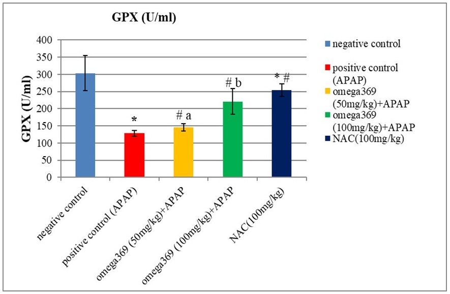 Background: As acetaminophen (APAP) toxicity has become more common in many countries, related cases of poisoning, whether deliberate or unintentional, have been identified as a key contributor to acute liver failure. Aime: To discover if omega-369 fatty acids could protect the liver of male mice from the effects of acetamiophen. Methods: Thirty-five albino male mice were randomly assigned to one of five groups. Group 1 served as the "negative control" and received a single intraperitoneal injection (10 ml/kg) of normal saline on the eleventh day of the test following ten days of receiving liquid paraffin orally at a dose of 10 ml/kg. The liquid paraffin was given to group 2 "positive control". Group 3 received Omega 369 (50 mg/kg). Group 4 received Omega 369 (100 mg/kg). Group 5 received N-acetylcysteine (100 mg/kg). The mice were given Omega-369, N-acetylcysteine, and liquid paraffin via oral gavage for 10 days. Results: Group 2 had significantly lower levels of glutathione peroxidase (GP-X) and superoxide dismutase (SOD) than group 1, but significantly greater levels of malondialdehyde (MDA). GP-X and SOD levels were significantly higher in mice given the doses of omega-369, and N-acetylcysteine prior to acetaminophen administration, whereas MDA levels were significantly lower in groups 3, 4, and 5 when compared with group 2. Conclusion: Omega-369 fatty acids, when taken orally, exhibit antioxidative effects and may reduce the risk of acetaminophen-induced liver injury.